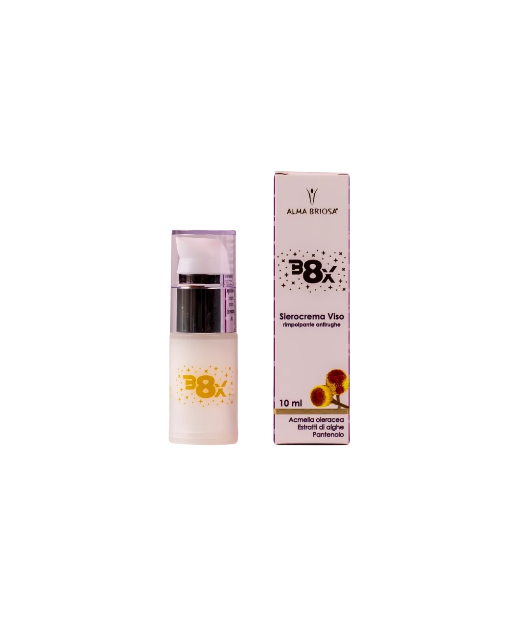 B8X è un innovativo sierocrema viso formulato con estratto di Acmella Oleracea, una pianta nota per le sue proprietà rimpolpanti e distensive, capace di attenuare visibilmente i segni dell’invecchiamento cutaneo e di favorire la riparazione delle rughe funzionali, oltre a rassodare il derma.*